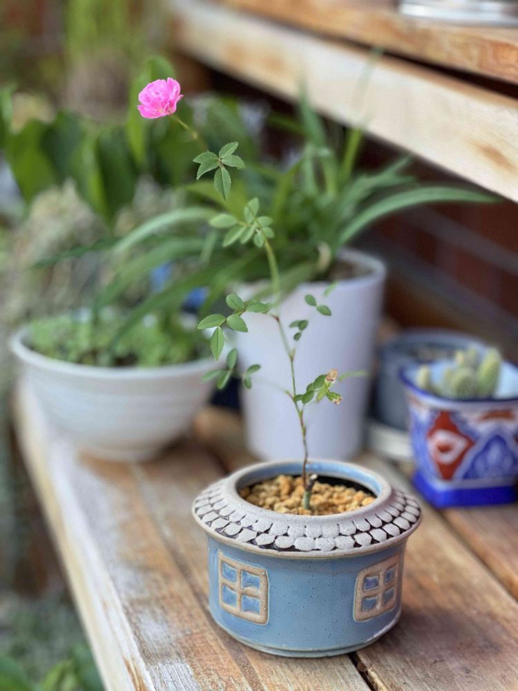 この鉢にはマイクロミニバラを植えようとウチの子を挿し木してたんてすけど、なかなか成功しなくて、去年やっと成功して今年お花が咲きました👏👏👏