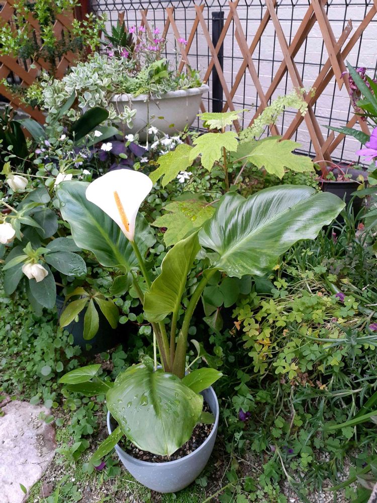 枯れてしまったと思って庭の隅っこに置いていたカラー。