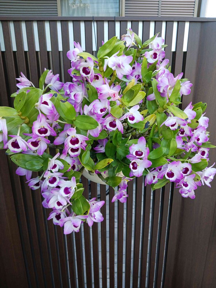 ⑤弟にプレゼントしたデンドロビウム。門扉に掛けておいた。一年中外栽培だと今ごろ満開😉👍️✨。