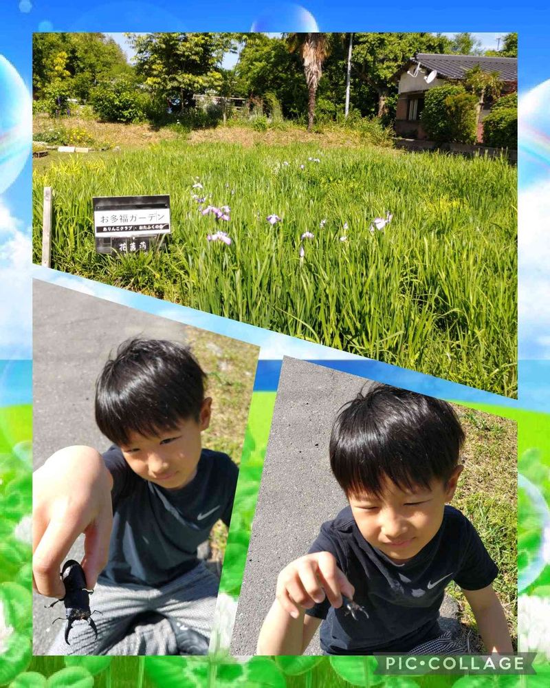 今日は朝9時30分頃じぃじばぁばのお多福ガ―デンに、遊びに行きました。クワガタが花菖蒲の上の畑の🌲木に