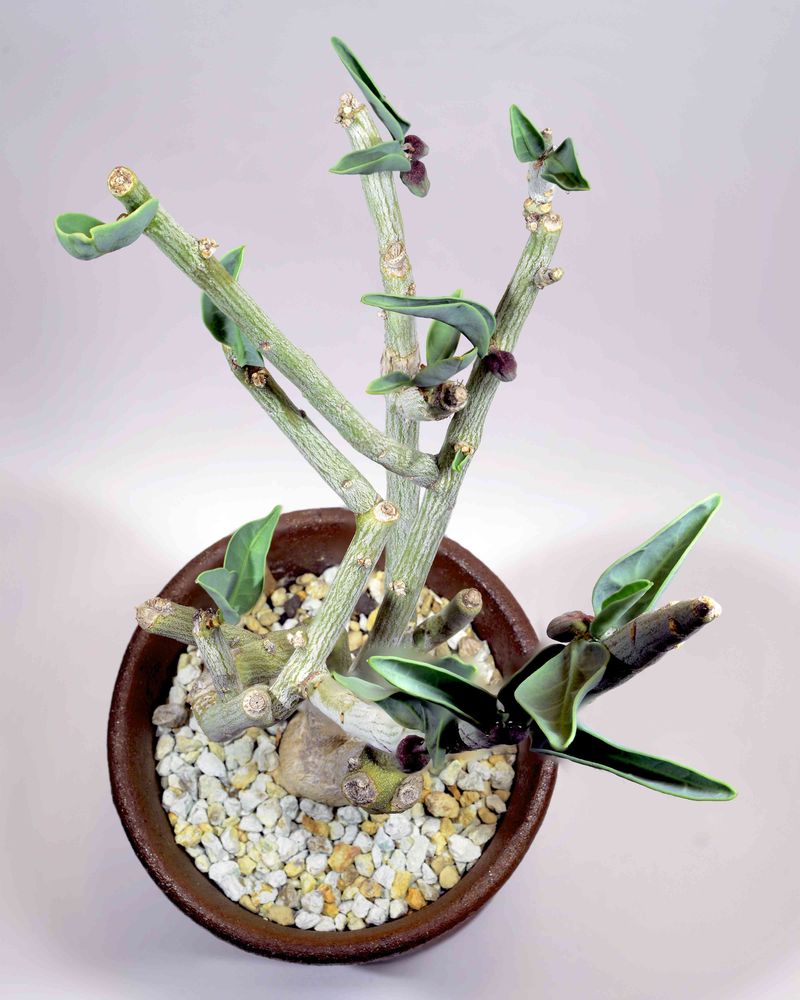 ナミビア出身のアデニア・ペチュエリーです。主に茎で光合成しているので、全体として葉が少ない感じです。灼熱の過酷な環境に適応した結果だと思います。