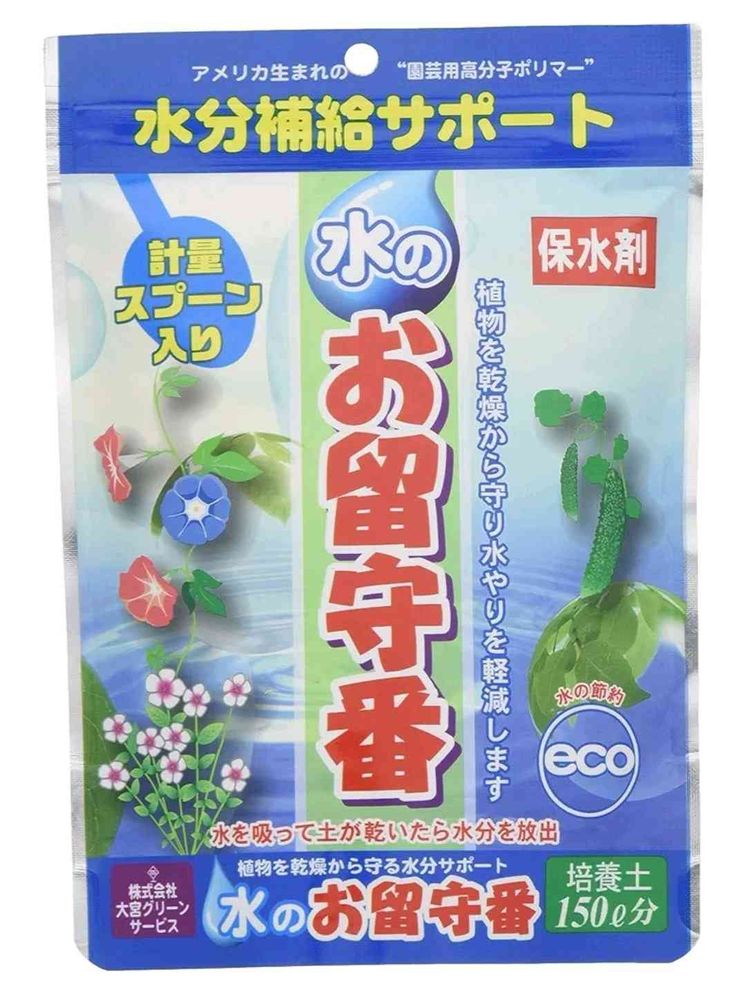 植物を乾燥から守る水分サポート「水のお留守番」は、土に浸透した水を150倍~200倍まで吸収し保持する。