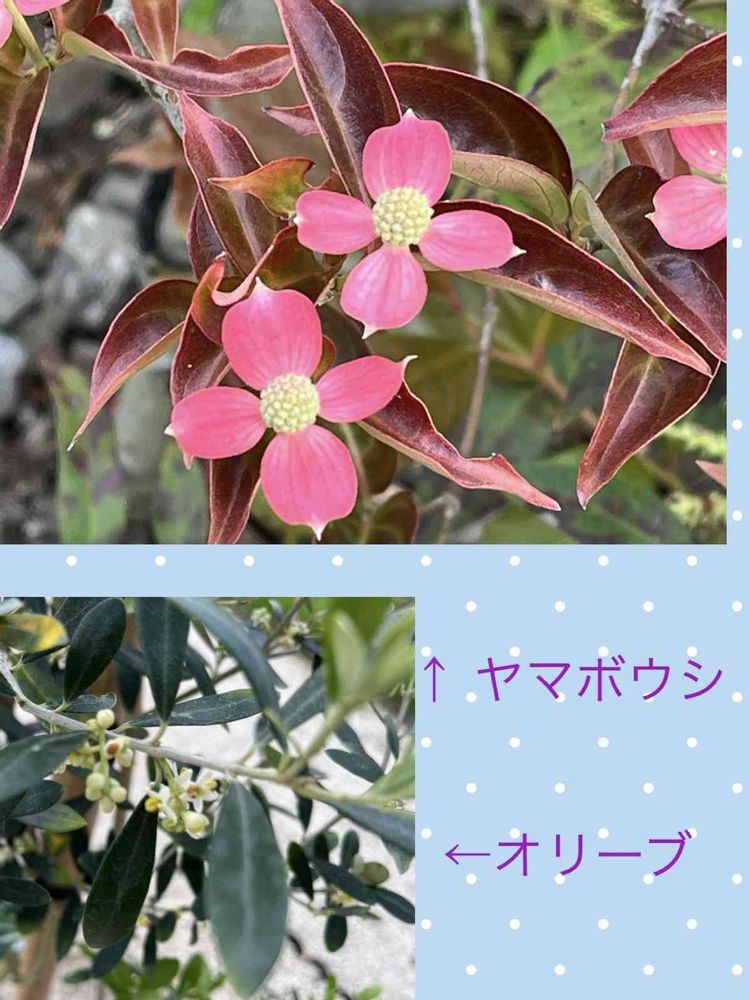 娘と孫ちゃんが帰省するタイミングに、記念樹のヤマボウシとオリーブに可愛い花が咲いています💕