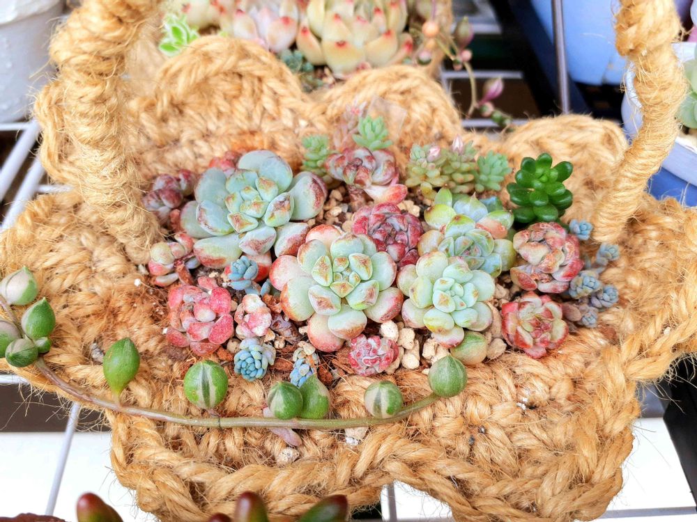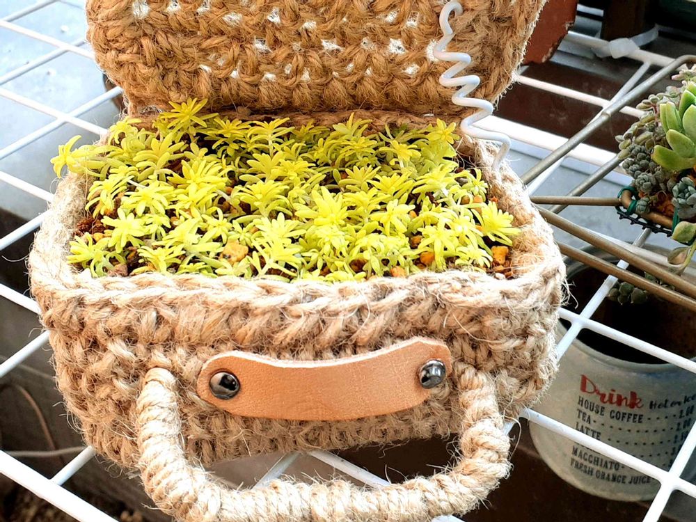 5:オマケ 🏷⸒⸒夜なべっこ ✂️した黄金細葉万年草を編み編みバスケットに〜こんな事してるとshiさんに頂いたガーデンチェアーも