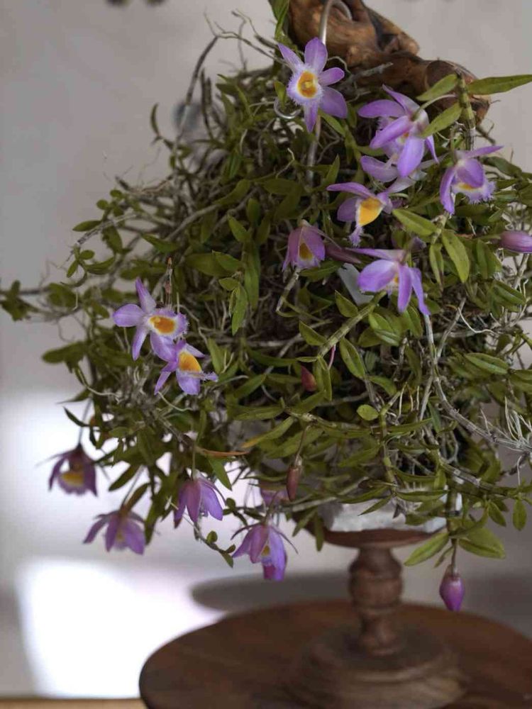 石の台と穴の空いた流木が金属の棒で繋がっているオブジェがありまして、その流木の穴に、へご付けで平に育てられたデンドロビウムを縦にしてぶら下げた…という状態です(伝わるかな?
