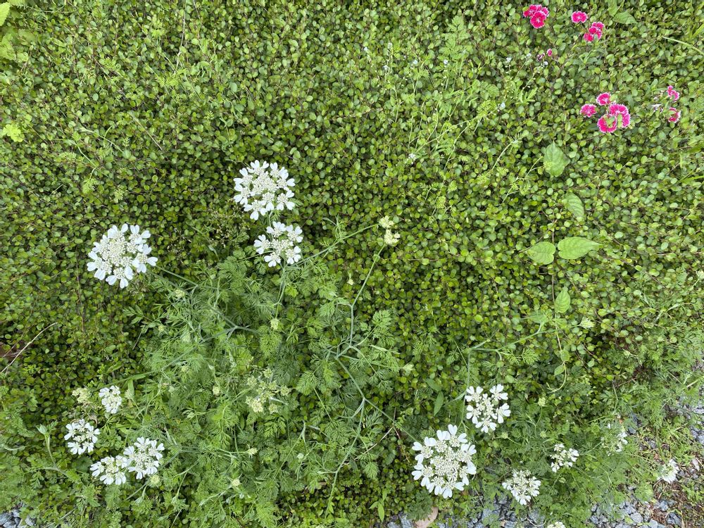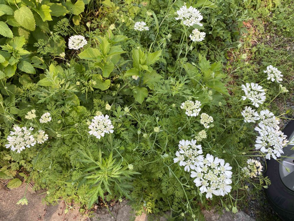 オルレアホワイトレースの一人生えが、あちこちで清楚な白い花を咲かせています😊