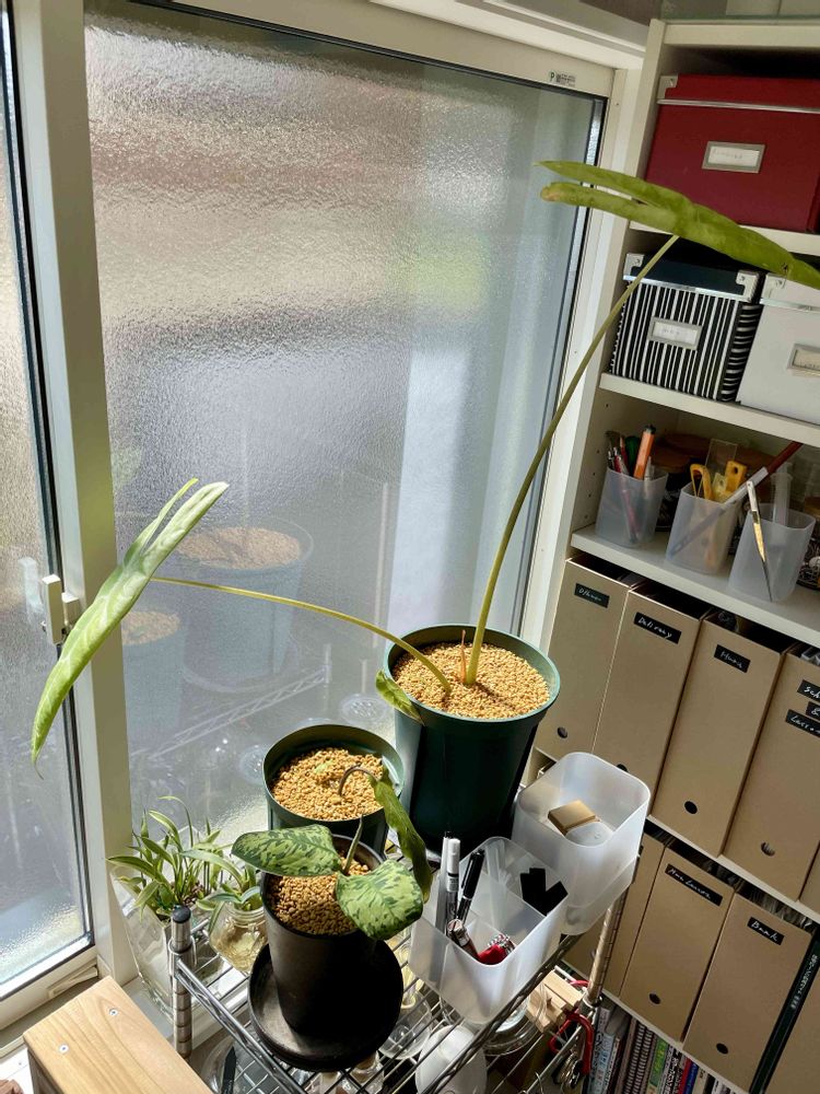 どうも調子が上がらなかったアロカシアを植え替えました。ワトソニアナは成長点が無くなってしまい、子株をたくさん出そうとしています。根っこは健康だけど根鉢になってました。ホマロメナもついでに植え替え、6鉢に株分。アリノスダマはなかなか起きてきませんが根っこは綺麗でした。みんな元気に成長しておくれ。