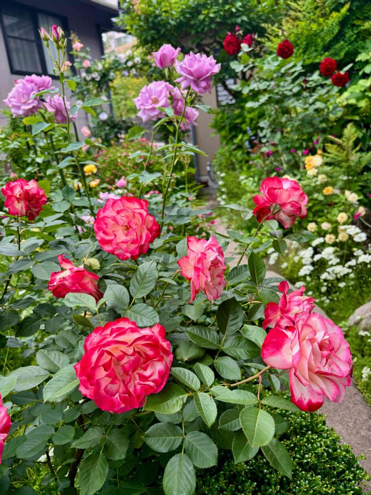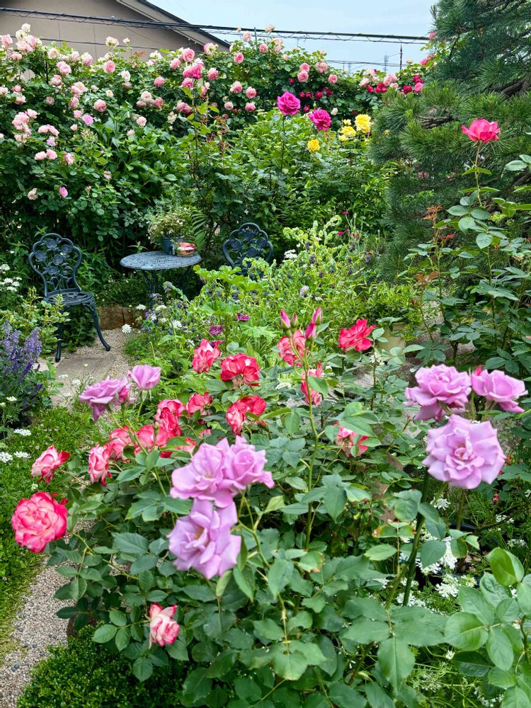 🏡団地の和庭を薔薇とオルレアとハーブが覆い尽くし狭庭となっております😆知人が庭に名前つけたら、というので「虹和バラ園」と言おうって思ってます💖🌈🌹