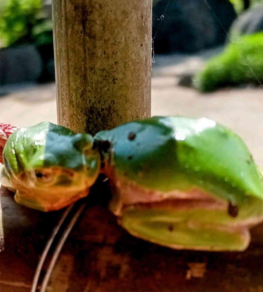 2枚目は暑すぎるため、竹の陰で寄り添うカエルちゃん🐸🥵💦💦真夏☀のようです😱😱😱て、ちょっとラブリ〜😆💓