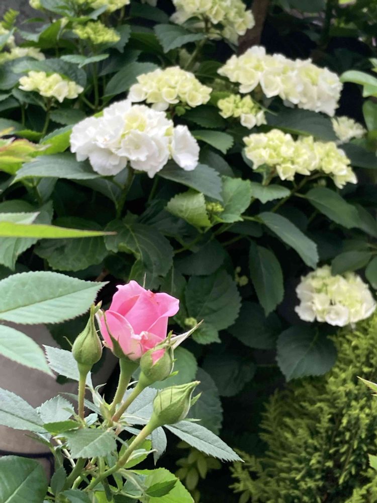ミニバラのピンクの蕾と紫陽花の白がとっても綺麗です