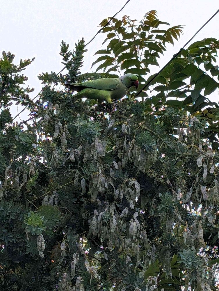 野生化したワカケホンセインコが2年ぶりにやってきた!アカシアの種をむさぼり食してます。