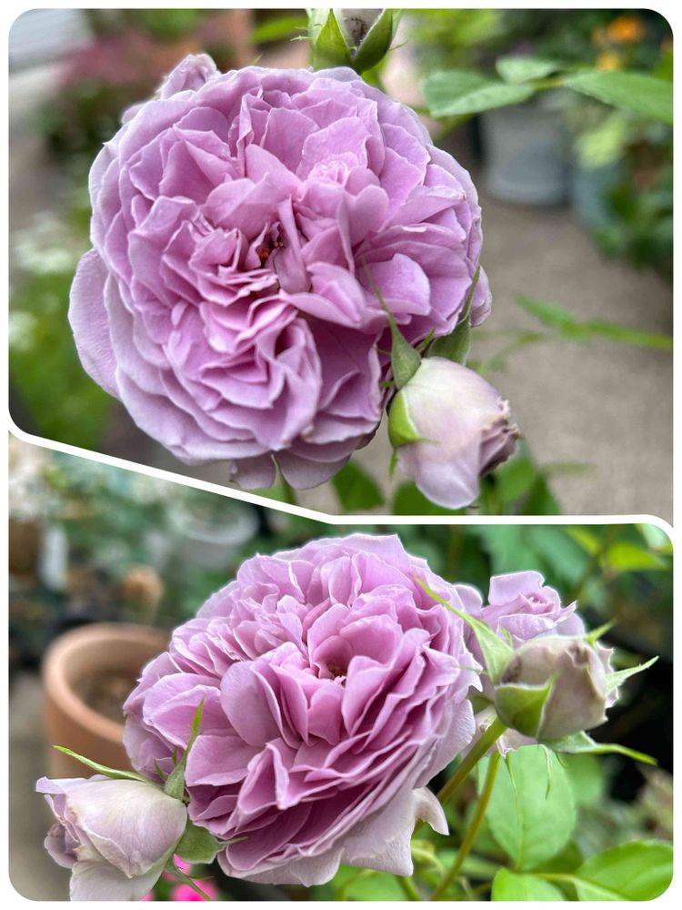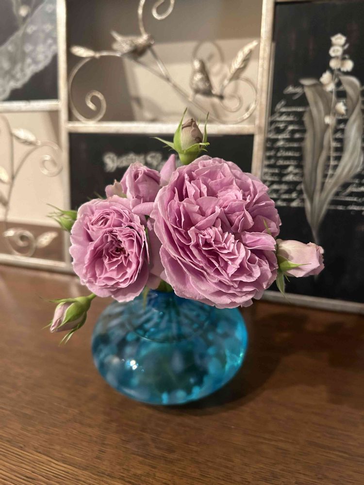 バラ レヴリの新苗を購入しました。すでに開花し蕾もあったので、株の充実のため切り花瓶に入れました。