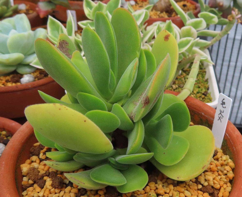 表面に細かい毛がいっぱい生えていて手触りがいい。時々シミが多い葉が出来るのが残念。