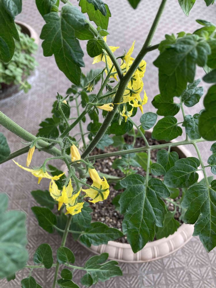 ゴールデンウィーク、帰省の際に購入したミニトマトのぺぺ‼️花が咲いたよ🌼楽しみ〜😊2枚目はまいた覚えの無い西洋アサガオと思われる植物⁉️去年育てたのでこぼれ種❓それにしても葉っぱが以上にデカい‼️15cmは有る😅去年は普通だったのに💦