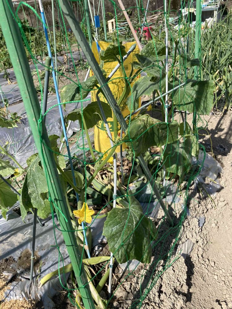 種から育苗のキュウリ、今年は四葉きゅうりの黒さんごを作っています。先日の強風もあんどんで被害は少なかったので、本支柱とネットを設置して、あんどん撤去しました。