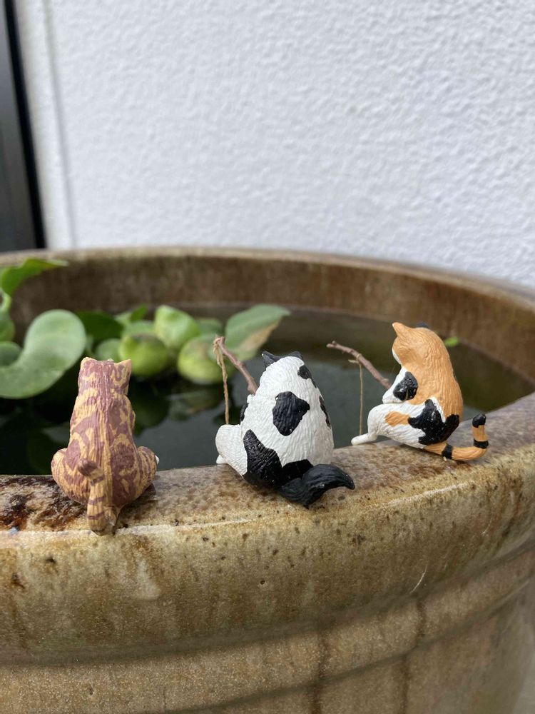 うちも同じように釣り竿持った猫ちゃんをメダカ鉢に飾ってます🐱