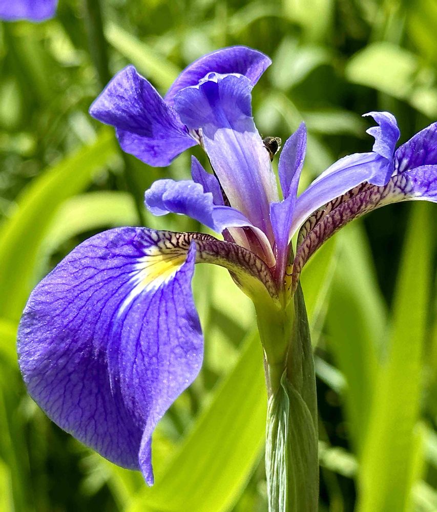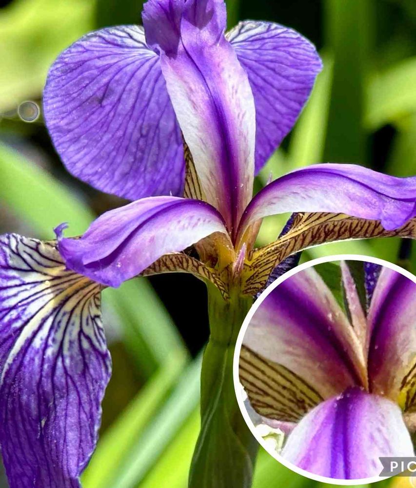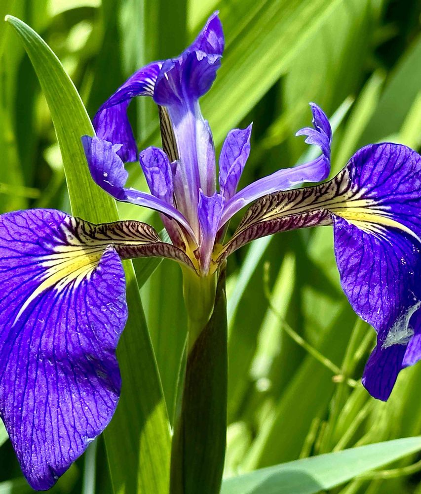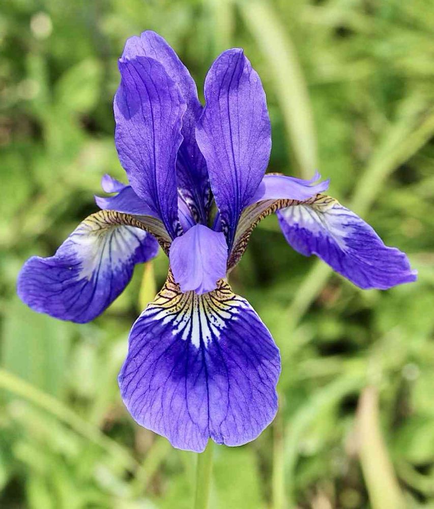 アヤメは花弁の付け根に鮮やかな網目模様(文目模様)が広がります。ノハナショウブ(園芸種はハナショウブ)やカキツバタにはこの網目は無く、代わりに白(カキツバタ)や黄色(ノハナショウブ/ハナショウブ)の筋があります。