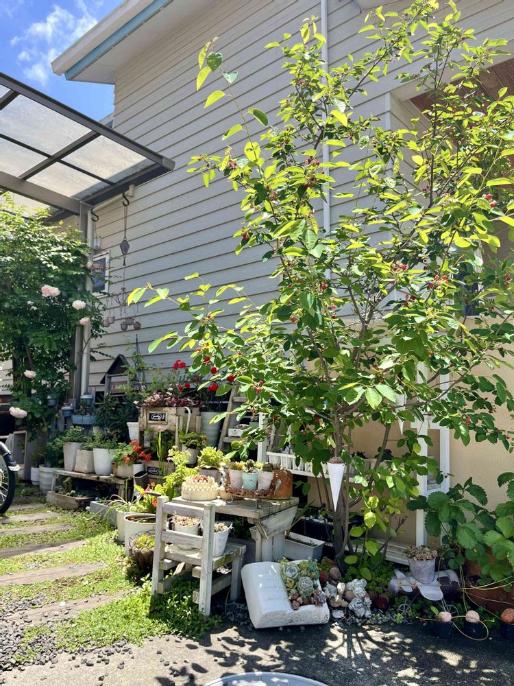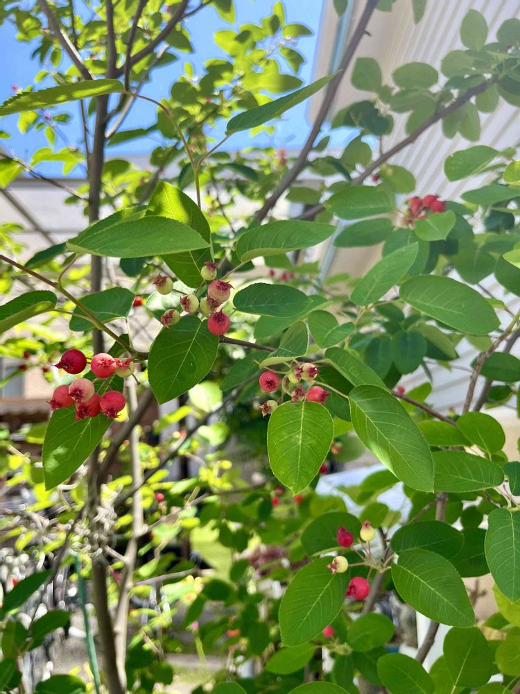 この季節のお庭は毎日変化があって本当に楽しくて、ヒマさえあれば庭に出てしまう。ジューンベリーの実をつまみながら。