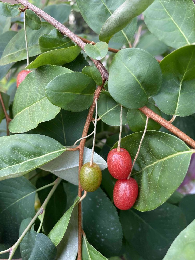 西洋グミが熟しました、そんなに美味しいものではありませんが果実の美しさとプニプニした触感が良いみたいで娘が早速食べていました