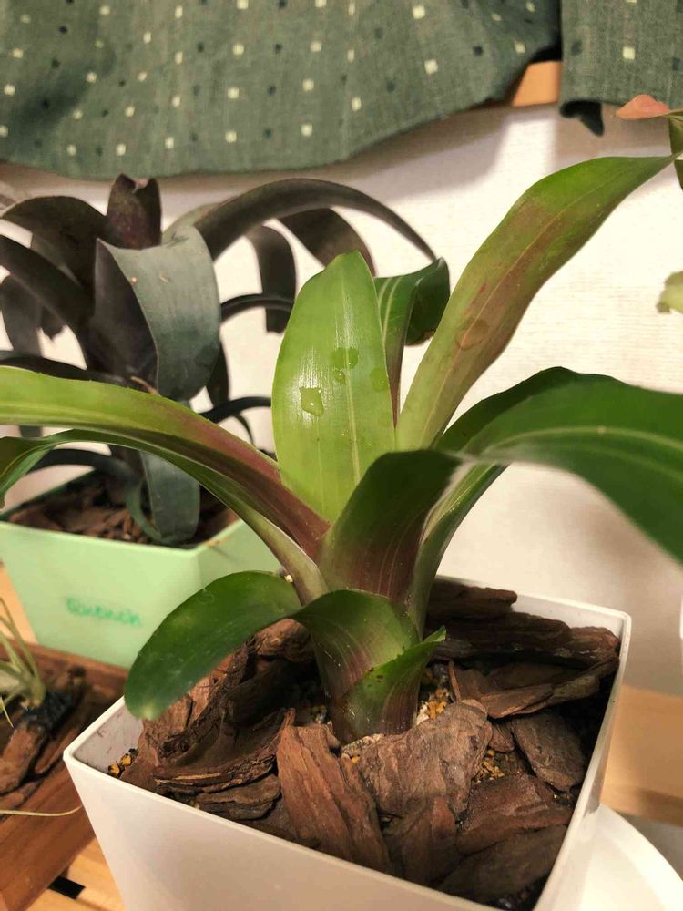 ネット通販で、去年買った株から子株を分けました。元は木にくっ付いてましたが、部屋にぶら下げると水やりが面倒で、鉢植えに。家の中で過保護に育ててるので、赤くないです。全然サンセットしないです(^^;
