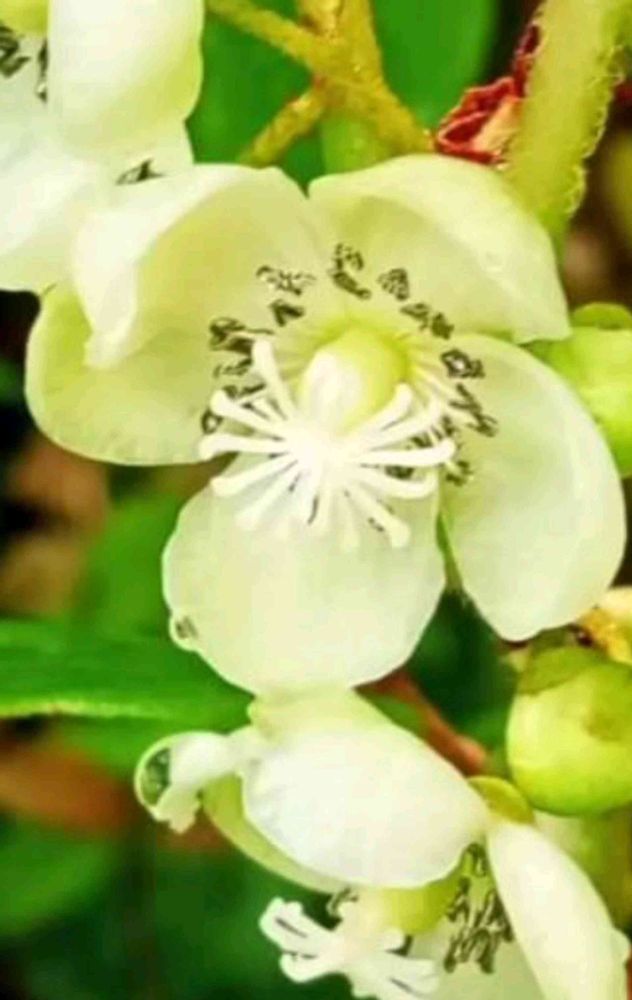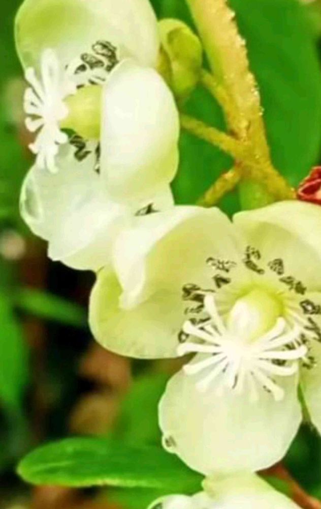 その棚から、キウイフルーツの淡いクリーム色の花が、顔を覗かせていました。