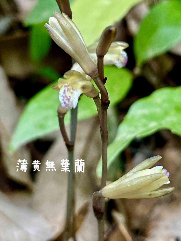 実は「ウスキムヨウラン」とも言うそうです…一部の図鑑や、多くのインターネット上の情報では「ウスギムヨウラン」と濁って記載されています。 確かに、ウスキよりウスギの方が言いやすい気もします。 しかし、本種を初めて記載した1995年の津山尚氏の論文では、『・・新種と認めてウスキムヨウラン(淡黄無葉蘭) Lecanorchis.kiusiana の名を与えた。』と濁らない記載となっています、なので命名者の記載を尊重し、ウスキムヨウランとも呼びます…