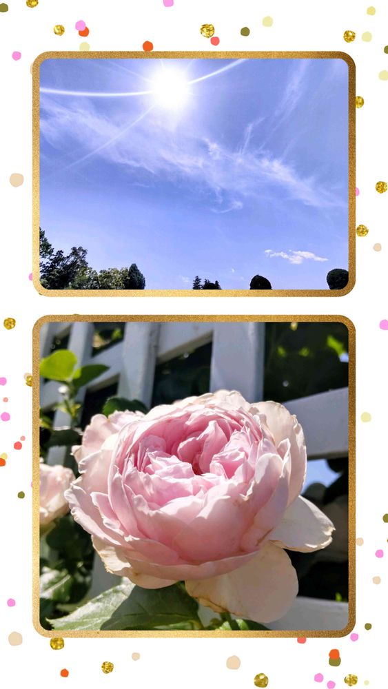 ①迎えてくれた…空の煌めきと、空を仰ぎ見て咲く桃色のバラ✨🌿🤍🩷
