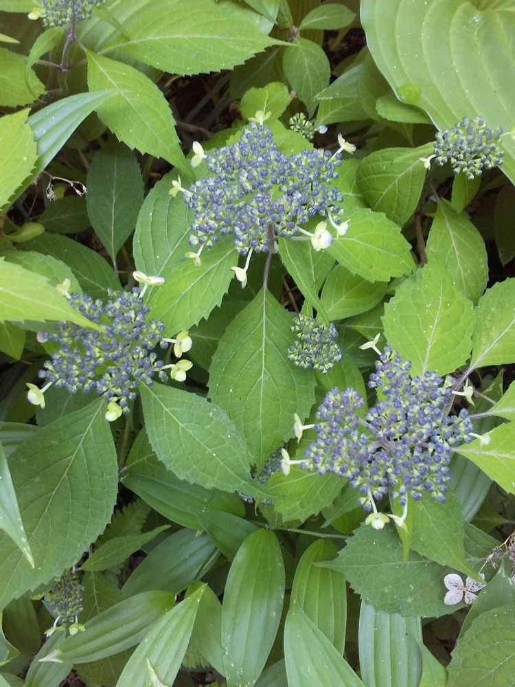 ヤマアジサイ`伊予の薄墨´の花が咲き始めました。だんだん黒色に変わっていきます。