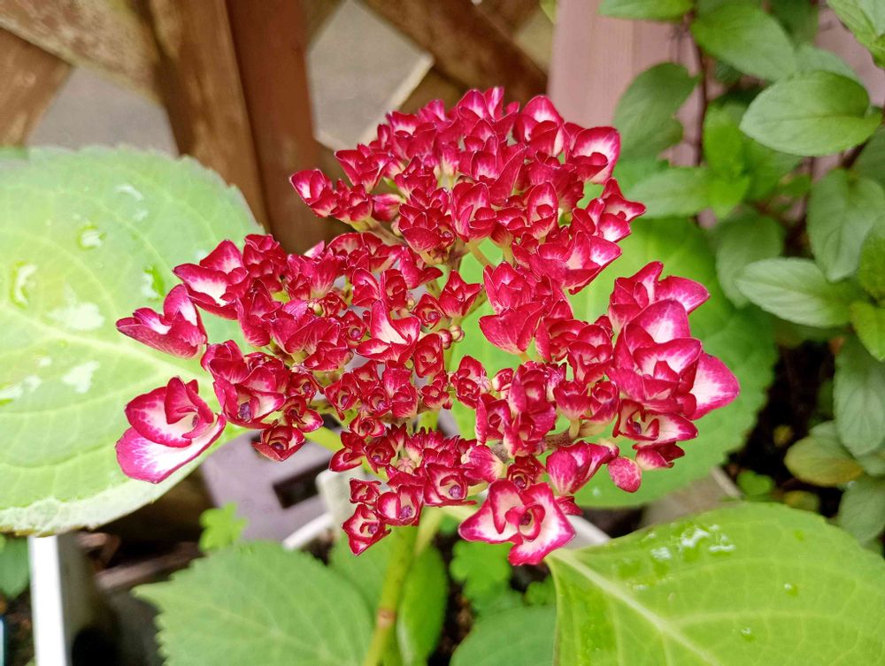 2️⃣昨年の花後に🌱挿し木した方にも蕾❤️(??) …ただ、この紫陽花を迎えた時に悩んだ花色😅❓「紫式部」→白に紫色💜🤍🌿の縁取りなのですが…紫というより赤っぽい😭やはり土質も関係ありそうですネ…🤔