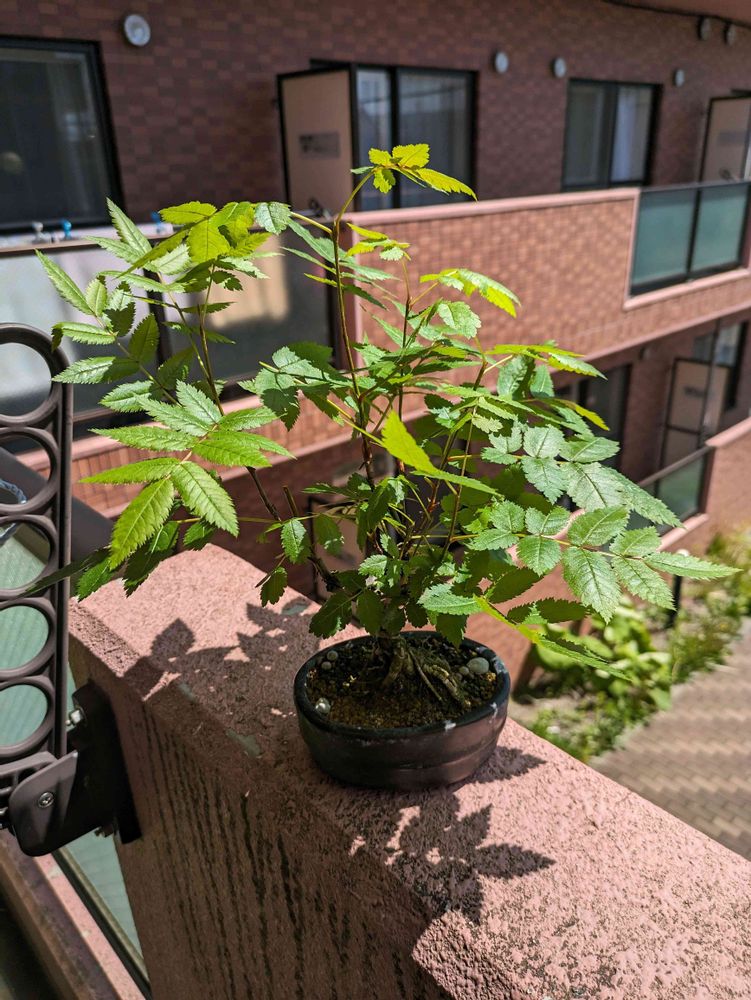 小品盆栽のナナカマドなのですが、徒長して節間が間延びしています(豆苗みたい💦)。ボサボサで見栄えが麗しくないので、切り戻し剪定をする予定。あと3時間ほど日照が当たれば詰まった姿になるのですが、仕方がない。やはり棚場は陽当りが良い方が、作は上がりますな。