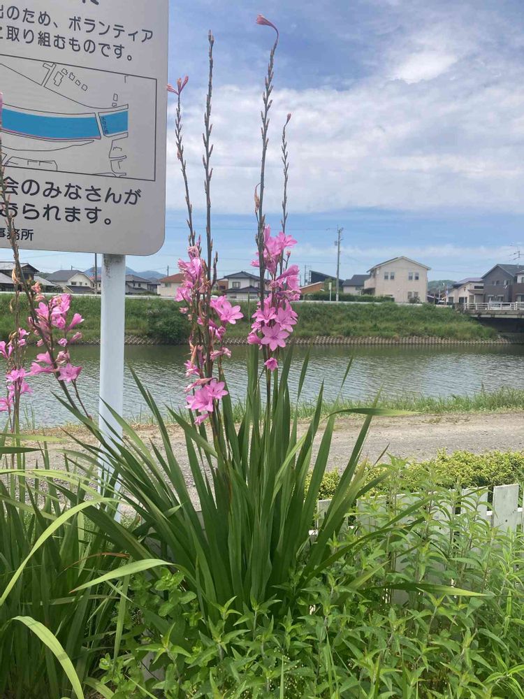 遠賀町へ行った時に川べりで咲いていました。植えられたものかもしれません。グラジオラスかと思ったら、すごく背が高いし、花も少し違います。わかる方、教えてくださいね。
