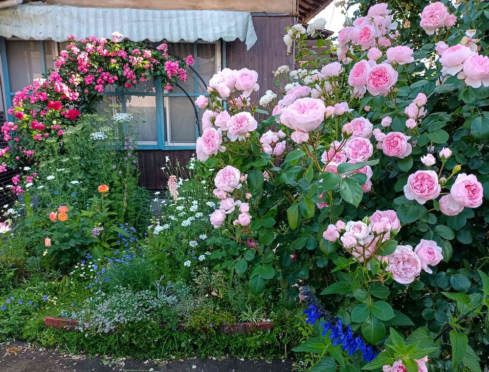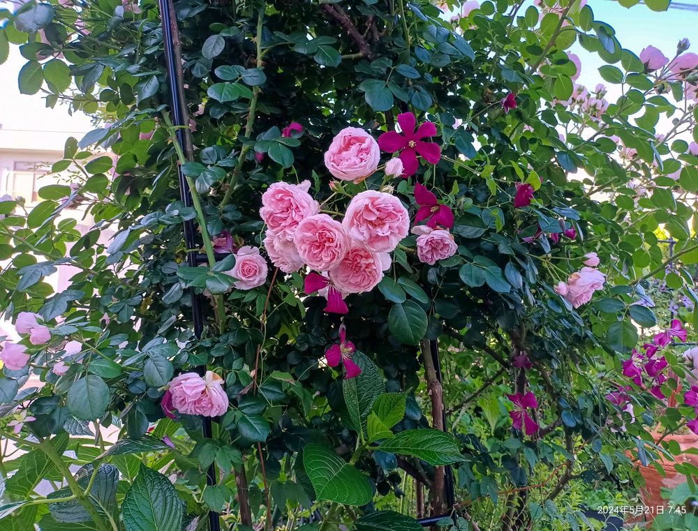今年は株元に鉢植えのクレマチス「マダムジュリアコレボン」を置いたのでうまくコラボできました!