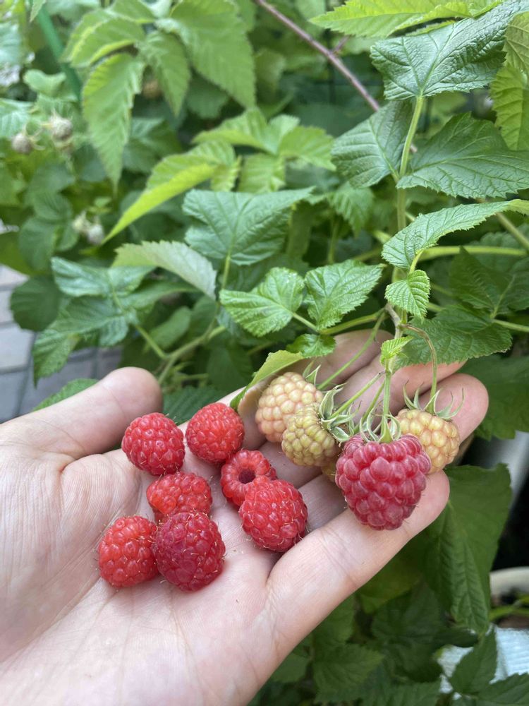 ラズベリーのルビービューティーが熟してきました、収穫して手に乗せているオータムブリスと比較してもカナリデカいです。