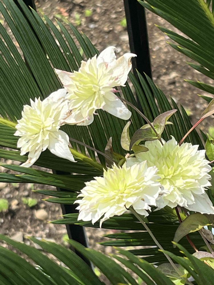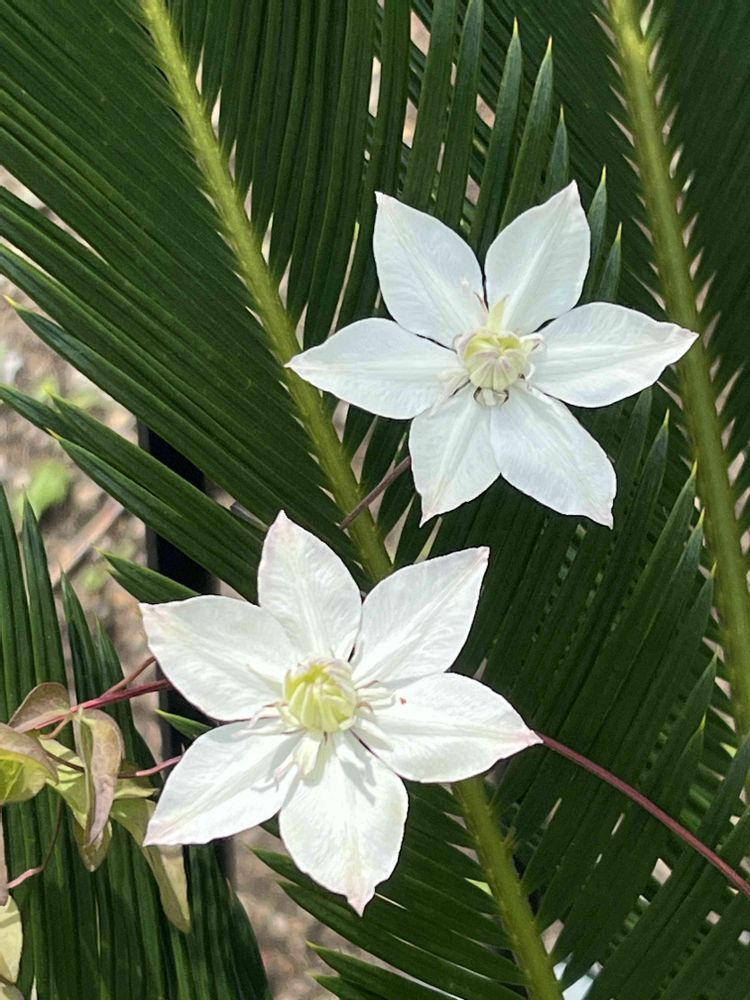 一昨日 勤務先の近隣の美容室前で撮ったクレマチスのお花と一緒の葉は おっしゃられる通り蘇鉄ですよ😊🌿
