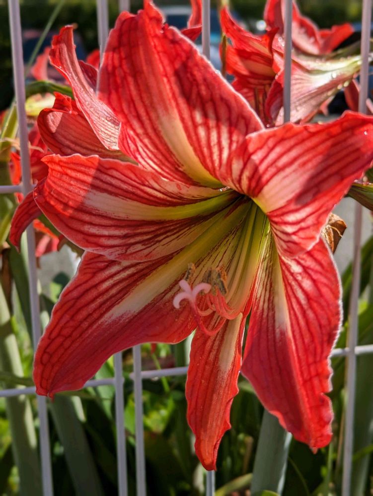 ③アマリリス ヒガンバナ科 アマリリス属 鮮やかな大きな目立つ花。これ、マンションの外金網の外側に咲いていました。