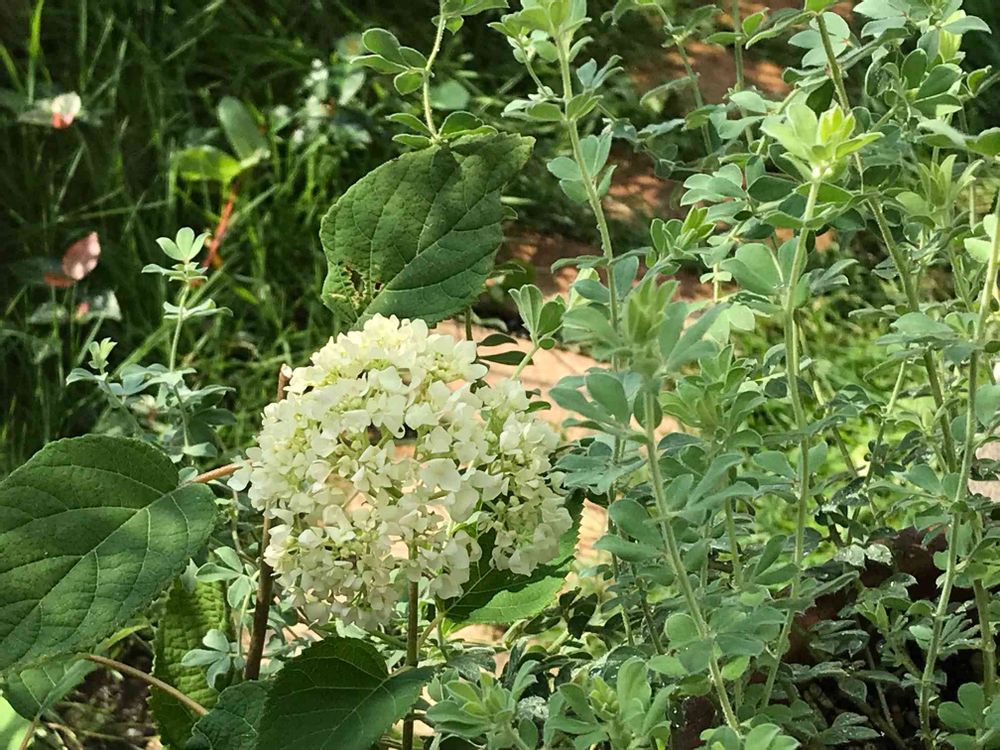 アナベルのピンカーベル、幼苗だからか猛暑だからなのか、色がピンクにならず白のままです🤔