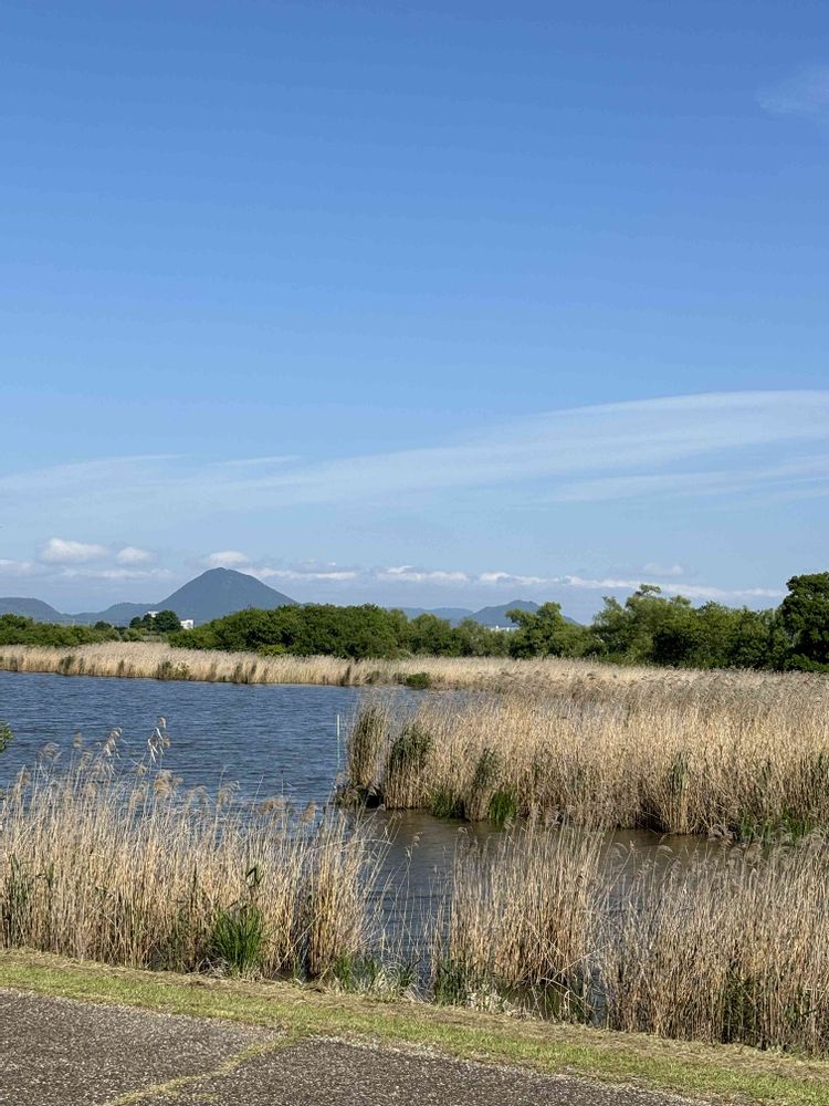 ヨシの生える水辺と向こうに見える近江富士(三上山)