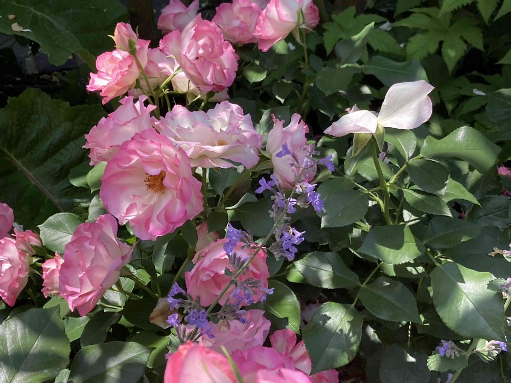 日差しの強い時に(素人には撮りにくい写真)美しく咲く薔薇を、その間に紫の一本のお花、(((o(*゚▽゚*)o)))♡