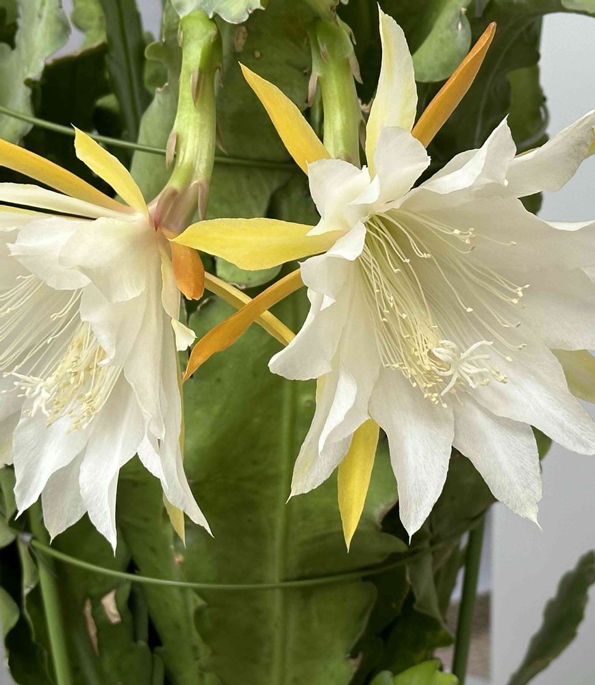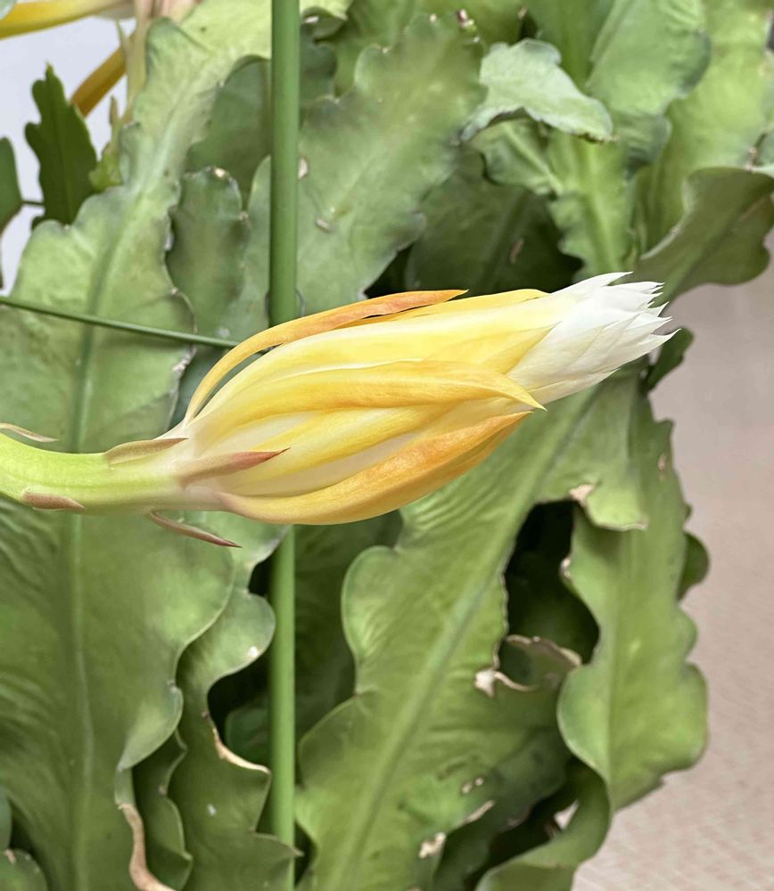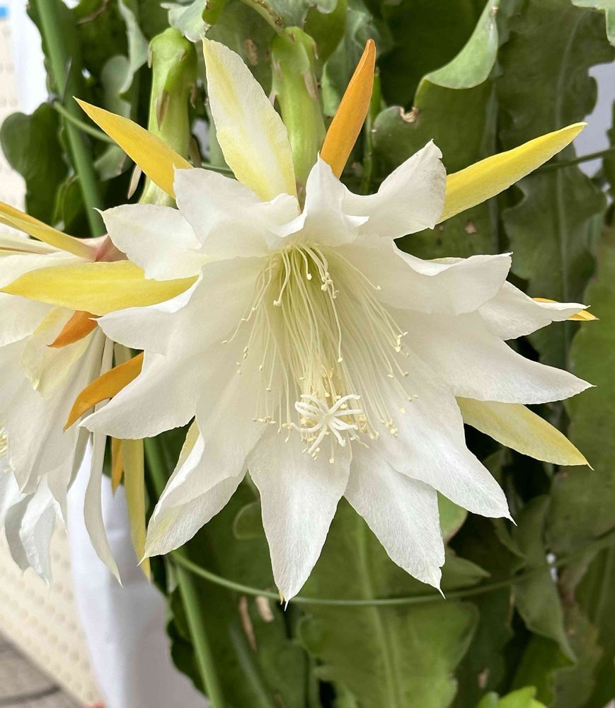 月下美人も白いお花が咲きますが、撮影した時間は午前11時過ぎでしたので、クジャクサボテンかと思います。