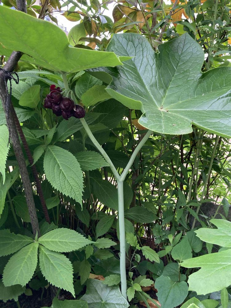 赤い実のような丸いお花を咲かせている大きな葉っぱは