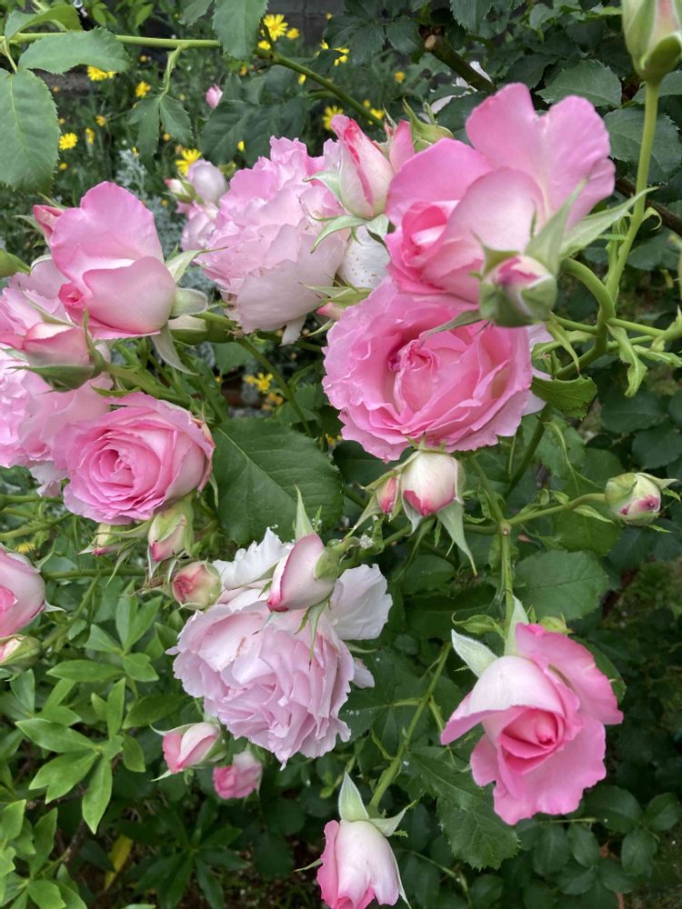 リアンローズの2番花です。一番花は雨風や急激な温度変化でほとんどがダメでした。その分2番花は豪華に咲きました。