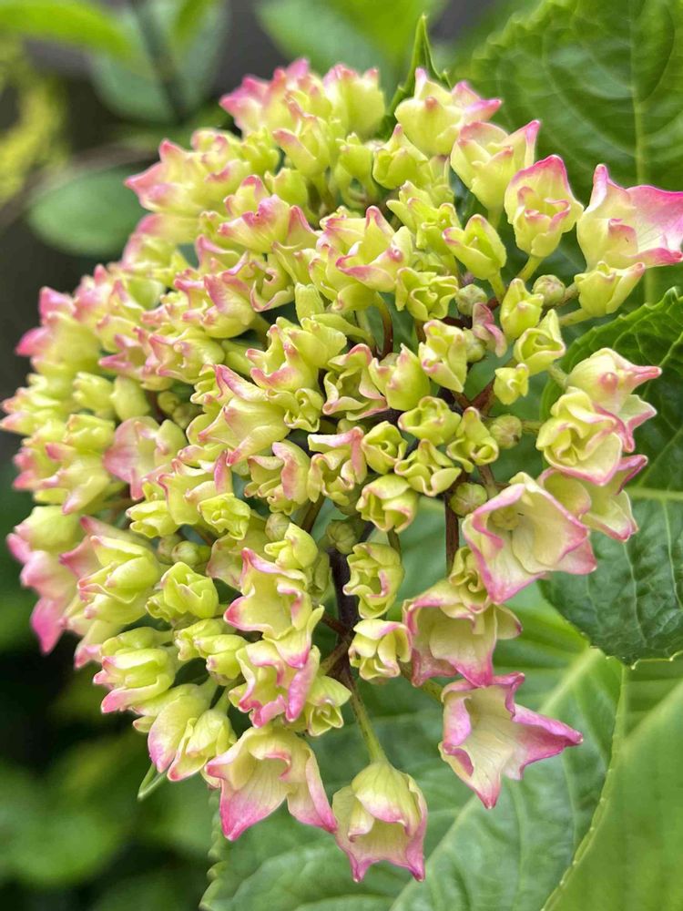 紫陽花ブラックスチールシリーズ・マクロフィラ・フィエスタが色づいてきています🎀💕黒軸が美しい✨後ろの黄色い葉っぱは、ハゴロモジャスミン・フィオナサンライズです🌿