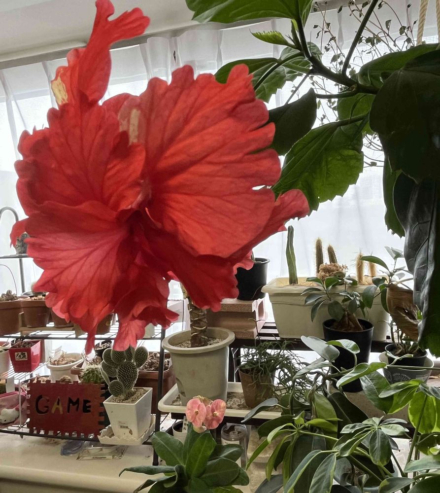 ハイビスカス🌺とハナキリン🌸の花が、窓際で咲いています🤗 咲いてくれてありがとう(*˘︶˘*).。.:*♡