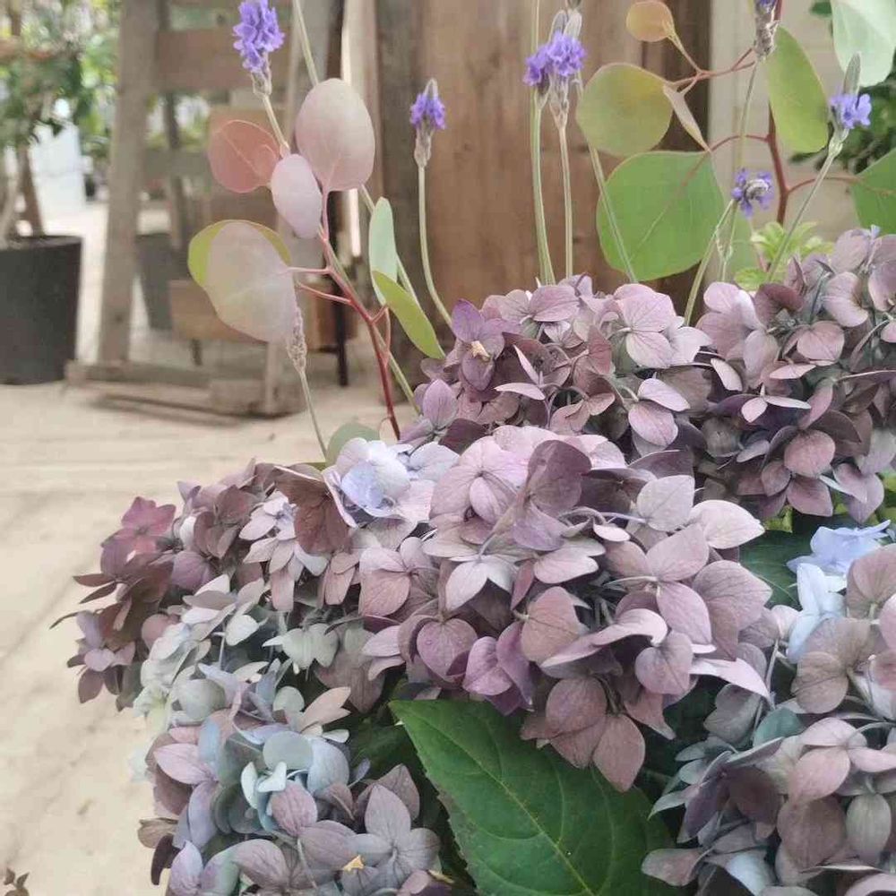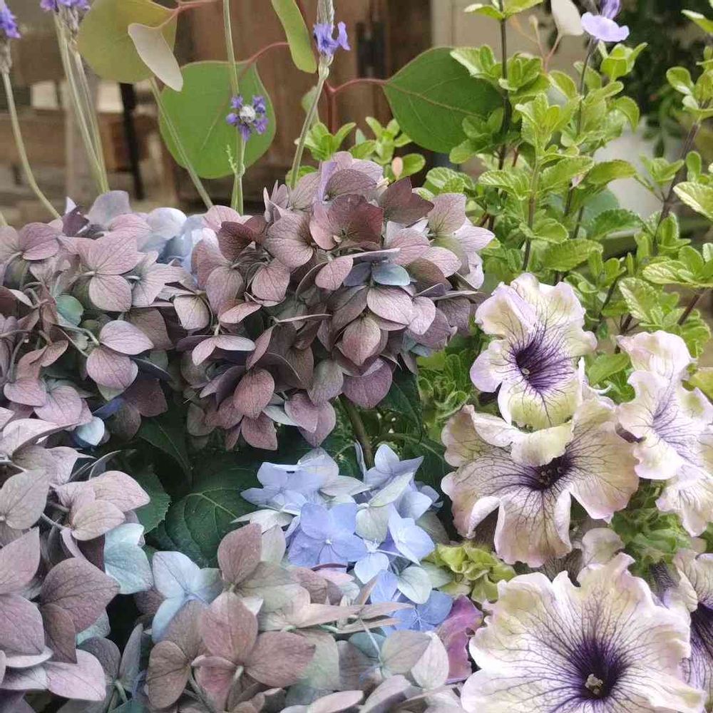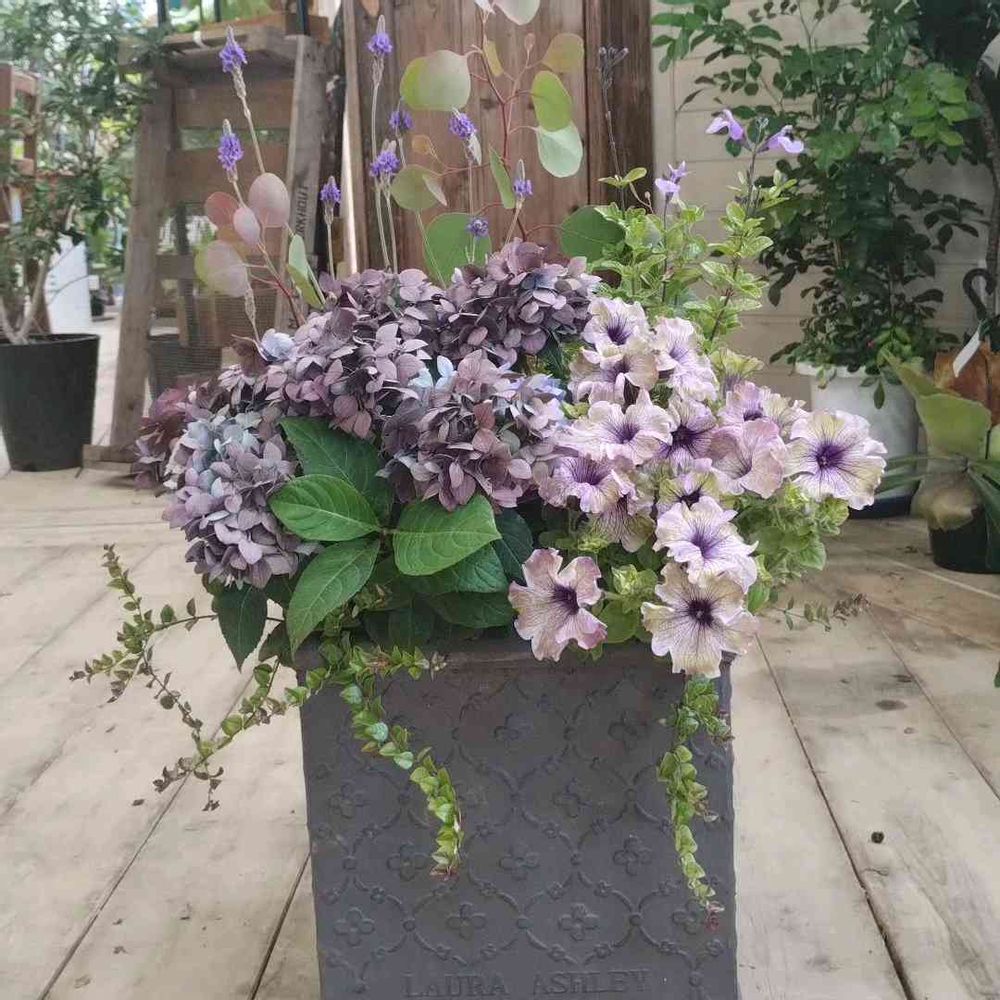 紫陽花てててまり、お花の色がライトブルーからシャビーなパープルへ移り変わっていて、そのひとときをこうして寄せせました。甘く渋い寄せ植えです(←先生のアドバイスなしでは、自分一人じゃ作れませーん(T_T))。