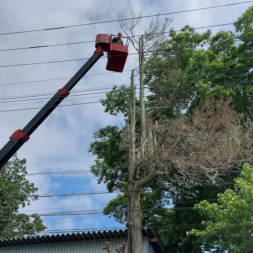 大型重機に職人さんが、三人🪚電信柱を超える高さ