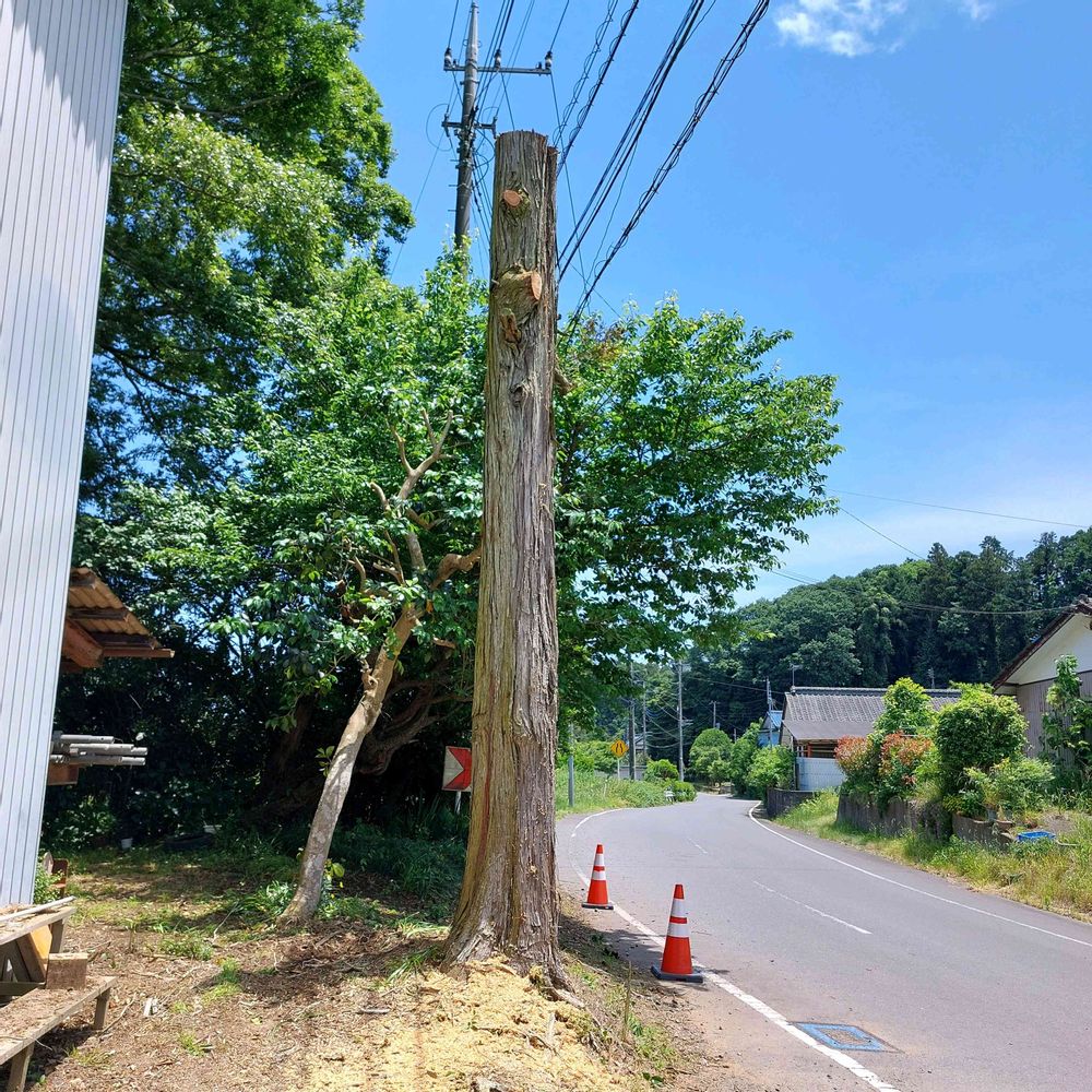 道路沿いのサワラの木が、枯れてしまい18日、お祓いをしてもらい22日、伐採しました