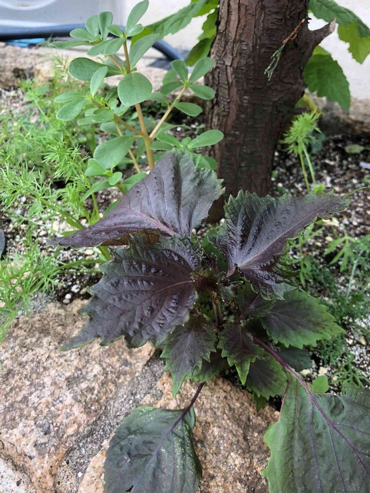 撒いた記憶のない子…。誰だ…とずっと思ってましたが、どうやら赤紫蘇っぽいです。葉を擦るとシソの香りがします!あってるかな…