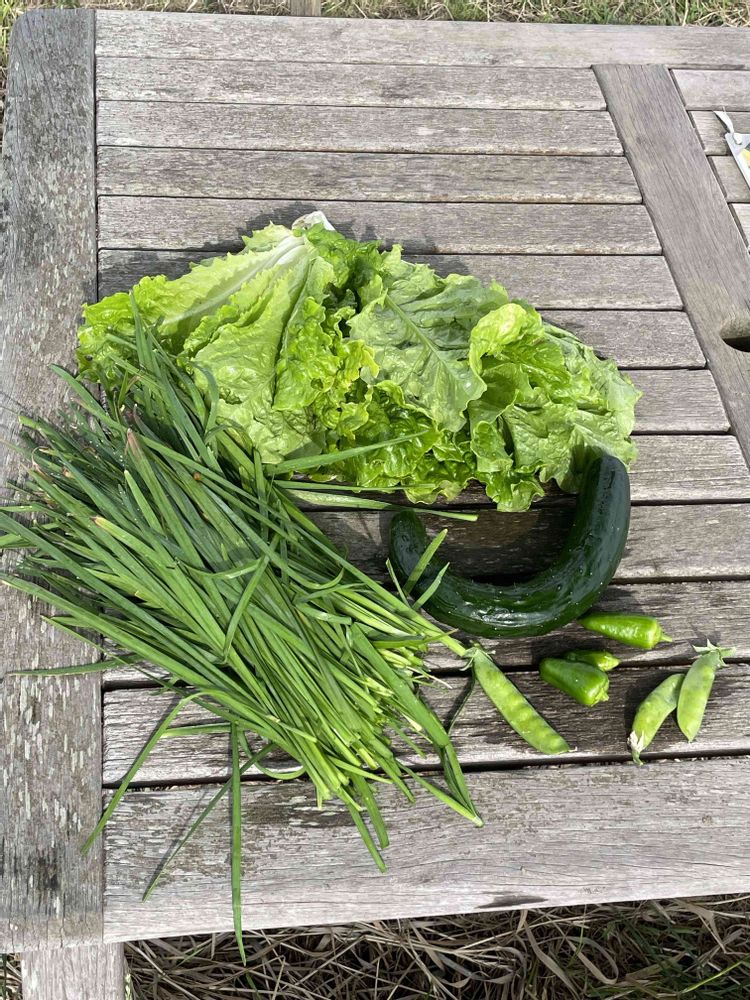 チマサンチュ、ニラ、初採りのキュウリ(強健豊作)、赤花絹さや