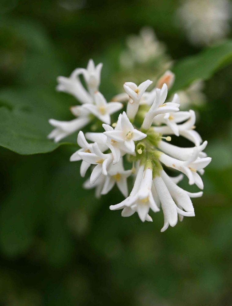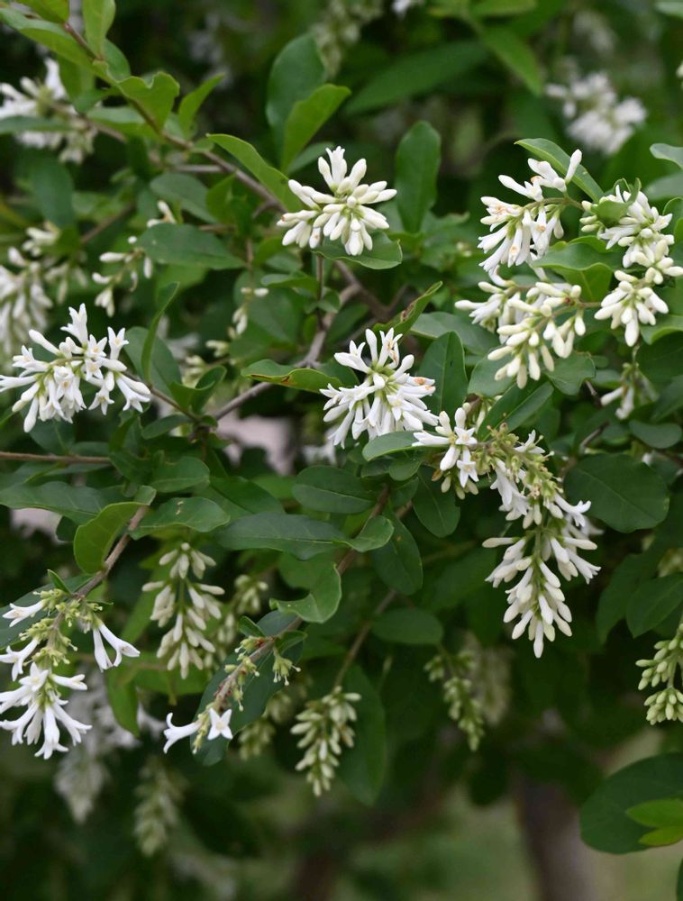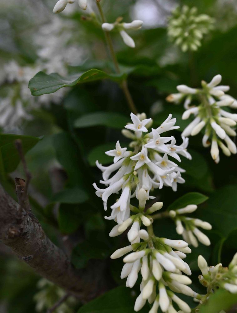 本年枝の先に長さ2 - 4 cmの総状花序を出し、ギンモクセイに似た芳香ある白い小さな花を密集して咲かせ、花序先端が垂れる。