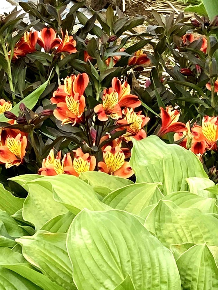 ②車道のすぐ脇に大株のギボウシと銅葉のアルストロメリア